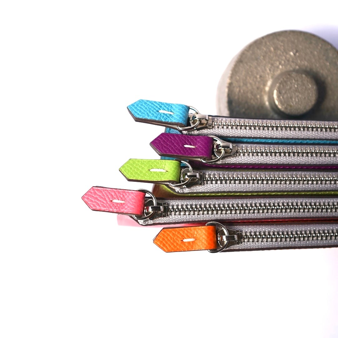 ファスナーの引き手も見えない箇所ながら、2種類の革を貼り合わせ、コバを磨いて手縫いで仕上げています。