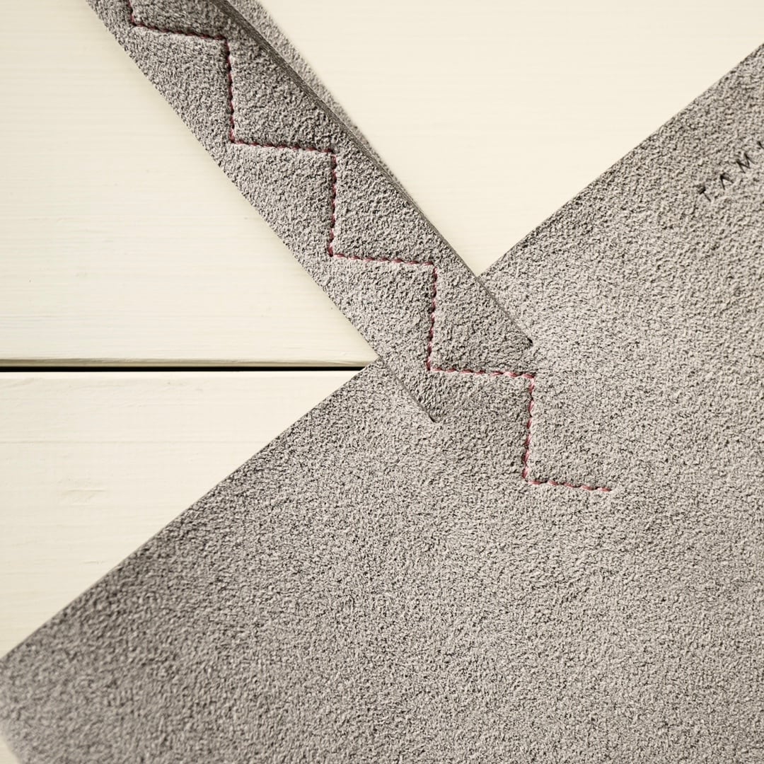 Ultrasuede®︎の質感を活かした作りにするため、1枚の生地を二つ折りにしてサイドを縫い閉じて袋状にし、つぎはぎのない面を大きく見せるようにしています。