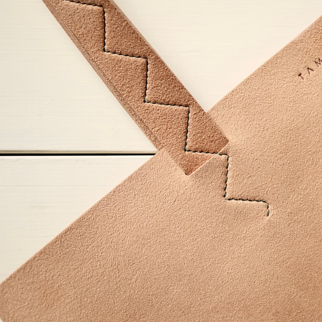 Ultrasuede®︎の質感を活かした作りにするため、1枚の生地を二つ折りにしてサイドを縫い閉じて袋状にし、つぎはぎのない面を大きく見せるようにしています。